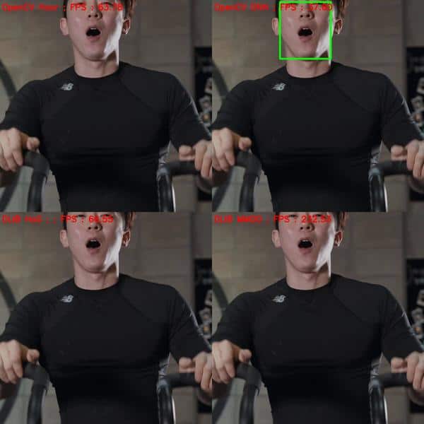 下面有一个例子视频,这位帅哥在做一个前后的健身动作,使得脸部区域变大变小。可以看到OpenCV DNN 检测出了所有的脸,而 Dlib 的方法只有在大于某个 size 的时候才被检测出来。